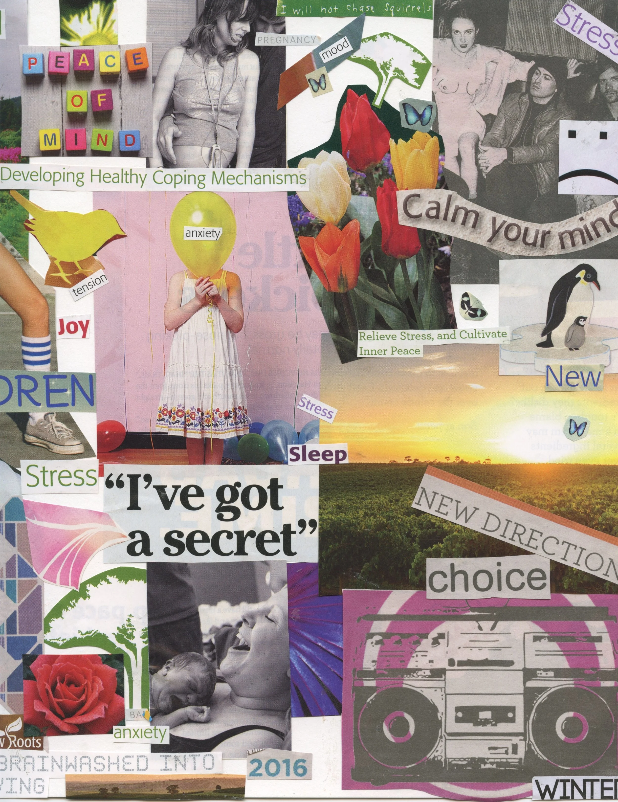 A series of collage workshops were delivered to birthing parents, using vintage magazines that were spliced and re-created to explore realities of being female identifying primary parents in today’s society. Two groups took place over the course of one year, with participants meetings for 16 weeks and creating together, while also forming connections between each other. The workshops resulted in a small exhibition of works, the publication of a zine that was distributed through community partners, and an article in Kolaj Magazine discussing the therapeutic potential of collage in working with this population.